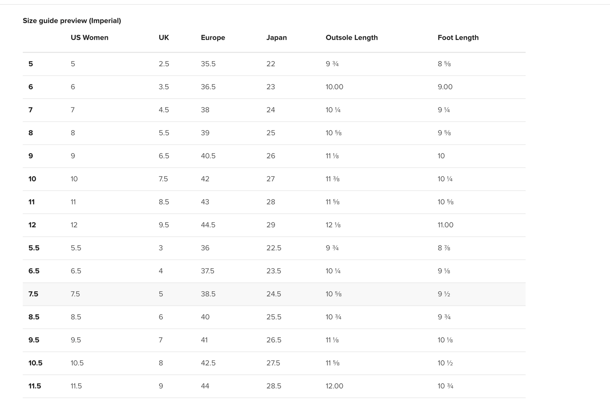 | US WOMEN | UK | EUROPE | JAPAN | OUTSOLE LENGTH (inches) | FOOT LENGTH (inches) | |