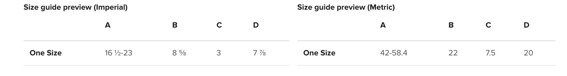 | One size | 16 ½-23 | 8 ⅝ | 3 | 7 ⅞ |