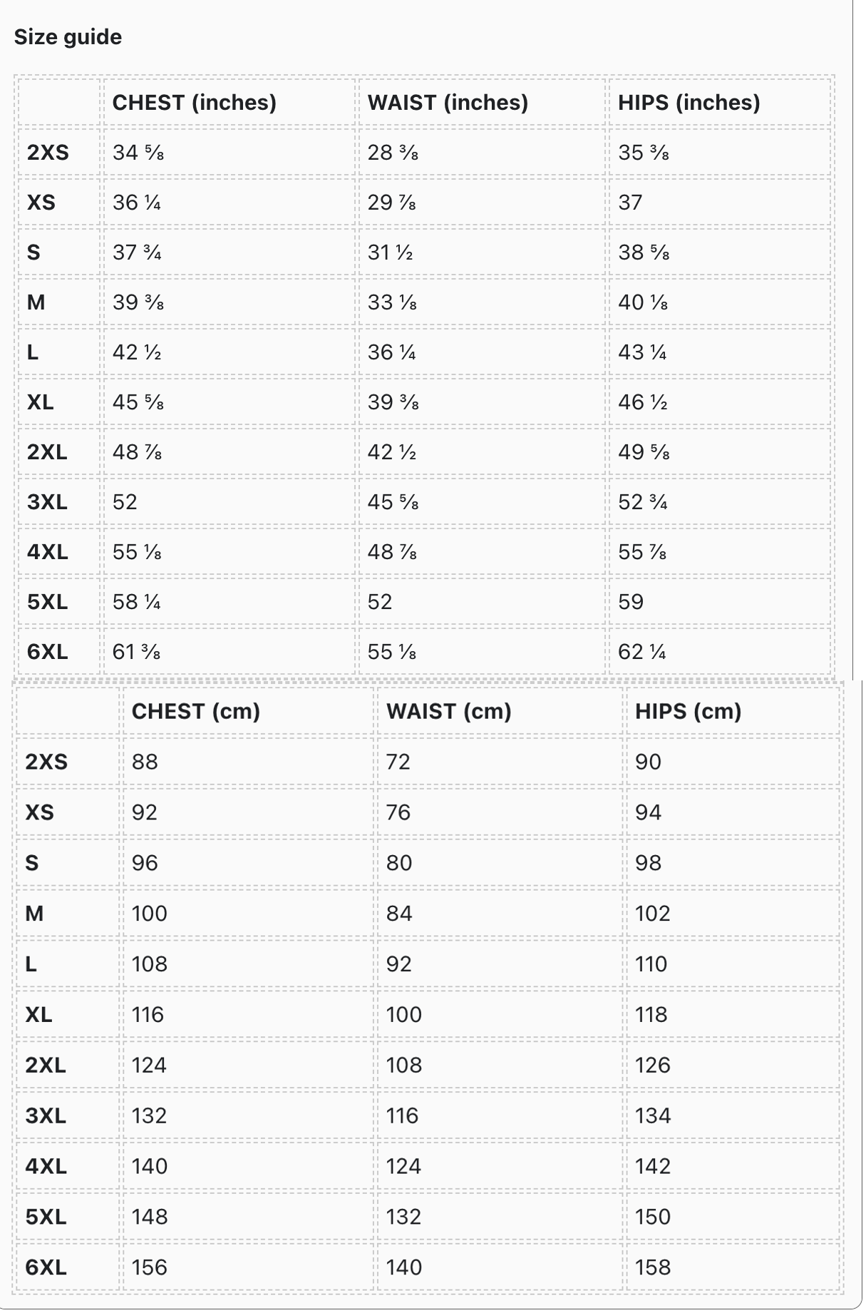 | CHEST (inches) | WAIST (inches) | HIPS (inches) | |