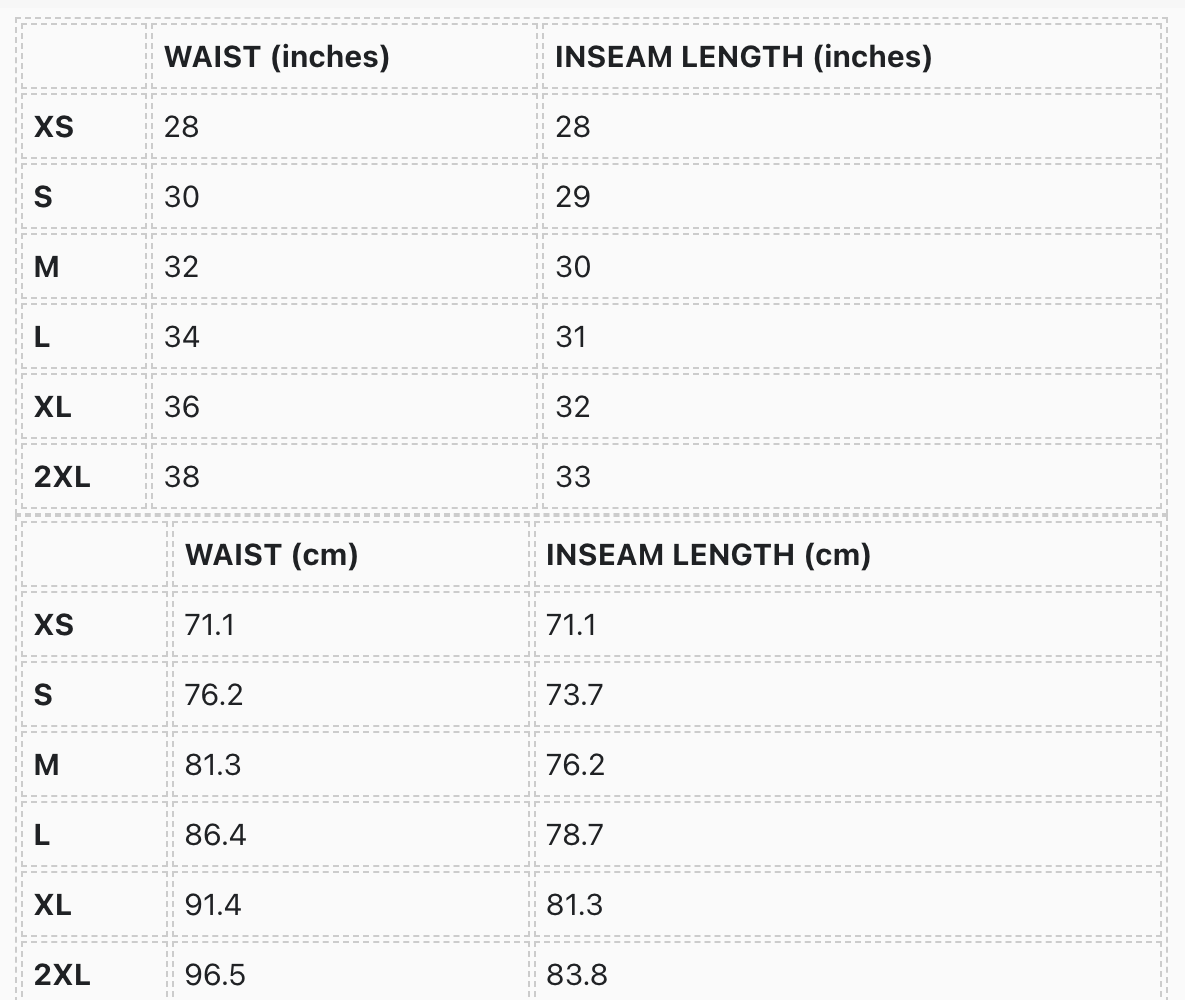 | WAIST (inches) | INSEAM LENGTH (inches) | |