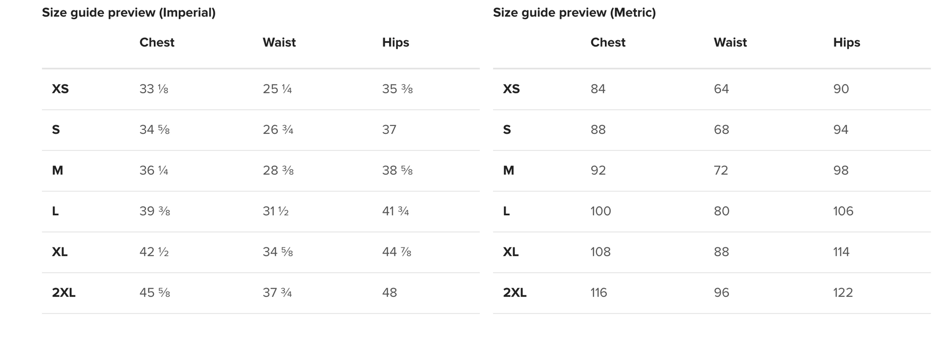 | XS | 33 ⅛ | 25 ¼ | 35 ⅜ |