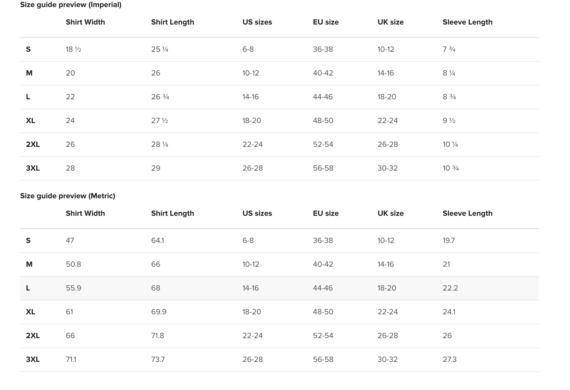 | SHIRT WIDTH (inches) | SHIRT LENGTH (inches) | US SIZES | EU SIZE | UK SIZE | SLEEVE LENGTH (inches) | |